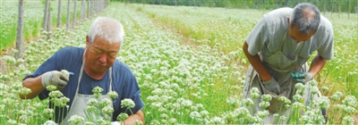 “现在正好是韭菜花盛开的季节。近年来,我们深挖韭菜的二产加工,从韭花蜜到韭花酱、韭种酱、韭种茶、韭种酒等,都很成功,已经批量上市。”李前庄村党支部书记、灵山韭菜专业合作社理事长刘成奎介绍,近年来,他们村积极调整农业种植结构,大力发展韭菜种植。“这几年,合作社找准发展道路,专业种植韭菜,平均每亩利润可达3万元。”刘成奎告诉记者。李前庄村韭菜基地采取“一年两茬菜一季籽”的种植销售模式,保障村民一年四季可收获。每年在韭菜除草、收割、捆绑,韭花采摘,韭菜籽翻晒等农忙时节,还能为周边村庄提供200多人的就业岗位。李前庄村村民赵立忠常年在韭菜种植基地打工,平均每天收入130元,“自从村里种上了韭菜,我们每年到韭菜种植基地里打工,在家门口既能挣钱,还能照顾家人,比外出打工强多了。”