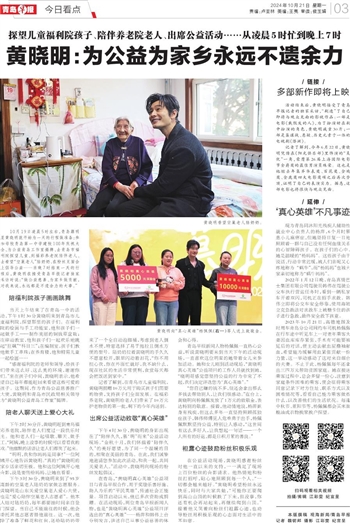 10月19日凌晨5时左右,青岛籍明星黄晓明就开始为一天的行程做准备:参加母校青岛第一中学建校100年庆祝大会、为公益青岛工作室揭牌、去青岛市福利院探望儿童、到福彩养老院陪伴老人、去看望“空巢老人”陆奶奶、在粉丝见面会上倡导公益……当晚7时结束一天的行程后,黄晓明在接受青岛早报记者独家采访时说:“做公益慈善、为家乡做贡献,对我来说,永远都是不遗余力的大事。”