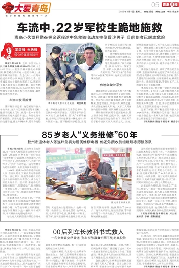 ~~~青岛小伙谭祥勤在探亲返程途中急救骑电动车摔倒昏迷男子 目前伤者已脱离危险