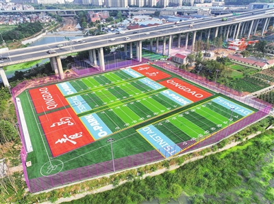 橙岛时尚体育公园充分利用高架桥下空间,从南到北依次规划了适合全龄人群的运动场地。南侧专为儿童打造了5000余平方米的游乐区,包括航海船、飞行秋千、梁龙爬网、环岛自行车、三联蹦床等,为儿童提供了更多游戏体验和探索空间。此外,橙岛时尚体育公园保留了青岛市果树园艺总场原有的“槭属植物种质资源”用地,槭属植物种类资源比较丰富,公园以此为基础打造了生态科普区。在这里,市民可以与孩子沿着一公里时尚跑道漫步,欣赏滨水美景,探索植物知识,步入式、零距离地对各色植物进行观察和学习,感受大自然的奥秘。后期通过开展“公园+生态”研学活动和园艺体验项目,为市民尤其是青少年搭建亲近自然、学习知识的平台,将生态文明教育融入日常生活,打造“家门口的自然课”。