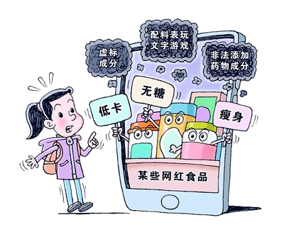 宣称“低卡、无糖、营养、瘦身”,近来一些网红食品打着健康卖点,迎合消费者心理,吸引了不少人跟风购买。但记者调查发现,一些网红食品虚标成分、配料表玩文字游戏,甚至非法添加药物成分实现所谓“减肥瘦身”等功效。消费者需擦亮眼睛,识别这些营销噱头和文字游戏,保护自身权益。