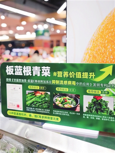 板蓝根青菜究竟有什么特别之处?记者了解到,板蓝根青菜是华中农业大学国家油菜工程技术中心研发出的新型蔬菜,编号“菘油1号”。科学家把菘蓝(板蓝根)和甘蓝型油菜杂交,将板蓝根中广谱抗菌的特性与油菜结合。与普通油菜相比,板蓝根青菜营养价值更高,口感没有了板蓝根的苦涩,取而代之的是类似菜薹的脆甜,并且对烹饪手法要求不高,清炒或涮煮都可以,不容易煮老。华中农业大学教授葛贤宏曾在采访中表示:“一开始我们将油菜和板蓝根组合,主要是为了攻克油菜的一种重要病害——油菜菌核病。由于二者亲缘关系较远,这个实验最后没有达到预期效果。但是在研究过程中我们发现,将板蓝根里的抗病毒成分导入油菜,获得的蔬菜不仅口感清甜,还具有显著的抗病毒、抗炎等特性。经过不断研究迭代,我们培育出了这款具有广谱抗病毒功效的杂交新品种‘菘油1号’。”经过3年多的试种,板蓝根青菜实现批量生产,终于在今年初通过盒马鲜生首次大规模上市。青岛万象汇盒马鲜生相关工作人员表示,板蓝根青菜适合在高原种植,目前盒马鲜生在售的板蓝根青菜均来自云南,今年夏天,甘肃、宁夏等地的板蓝根青菜也即将上市,能够实现全国门店的稳定供应。