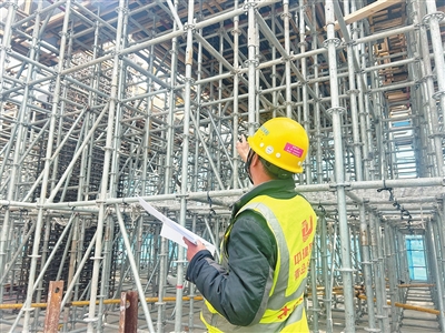 近日,在红岛控制中心二工区的施工现场,时安平正在现场指挥工人进行梁底顶托高度调整。他手中的图纸上密密麻麻标注着每条梁的标高及注意事项。“我的工作就是做在前面,指导工人不断提高施工质量,以标准化的流程促进项目质量和效益双提升。”他说。