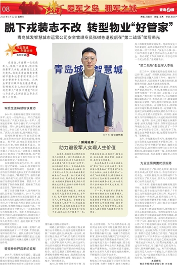 在青岛,有这样一位退役军人,他脱下戎装后,依旧保持着军人本色,在新岗位上发光发热,他就是青岛城发智慧城市服务运营管理有限公司安全管理专员张树栋。从热血军营到城市物业服务领域,张树栋用自己的经历诠释着退役军人“退役不褪色”的初心与志向,在新岗位上努力实现个人价值。