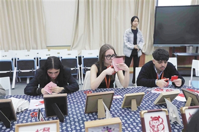 “宗家庄木版年画是中国绘画艺术中的一个优秀画种。它不仅是人们用以迎新春、祈丰年的民俗艺术品,更承载着中华优秀传统文化的深厚底蕴。”平度师范学校的老师向意大利师生详细介绍了宗家庄木版年画的悠久历史、丰富题材和制作工艺,一幅幅精美的年画作品让意大利师生惊叹不已。随后,来访的意大利学生在老师的指导下参与到木版年画的制作过程中。从刻版时感受刀具与木板的碰撞,到刷印时调配色彩、控制力度,每一个步骤都充满挑战。尽管语言不通,但在老师耐心示范和鼓励下,意大利学生们逐渐掌握了技巧,一幅幅木版年画在他们手中诞生。看着自己的作品,意大利学生们的脸上露出满意的笑容。剪纸课上,老师手把手传授基本技巧,如折叠、裁剪、镂空等。意大利学生们全神贯注,小心翼翼地操作着剪刀,一张张普通的彩纸在他们手中逐渐变成了精美的艺术品。学生们剪出了象征吉祥的“福”字、活泼可爱的小动物等,兴奋地互相展示,每一件作品都饱含着他们对中国文化的理解和热爱。