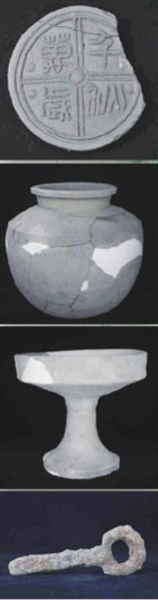 祝家庄遗址考古发掘中,共发现陶水管道4处,结合2012年发现的3组陶水管道来看,围绕着这处建筑基址至少存在7组陶水管道。7组管道内的单体陶水管形态、规格较为一致。从水管套合方式看均为建筑基址向外排水的管道,这组陶水管道共同构成了这处建筑基址的排水系统。在另一处建筑基址上,考古人员发现了一小段铺地砖遗迹以及大量残破、烧红的建筑构件等。铺地砖为菱形格纹饰的方形砖,一侧带有立砖封边。由于该区域靠近高速公路施工区,且该时期遗迹上部地层较薄,农业垦殖活动将遗址破坏严重,本期建筑遗存保存状态不佳。除了该处铺地砖外,地层中还发现一些菱形格空心砖残块,以及西汉中晚期常见的原始青瓷瓿残片,推测二期建筑基址时代可能为西汉中晚期。除了建筑构件外,还发现数量较多的陶器和钱币,种类主要包括罐、盆、甑、豆、盂、碗、瓮等生活容器,钱币主要包括半两和五铢。另外还发现有一定数量的铁器、铁渣和铁矿石等。