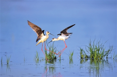 此外,张瑞生告诉记者,近日他还拍摄到了另一种珍稀鸟类——黑翅长脚鹬。黑翅长脚鹬属鸻形目反嘴鹬科长脚鹬属,是国家“三有”保护动物。因其细长的红腿与黑白相间的羽毛,行动时宛如优雅模特,也被称为“水鸟模特”“红腿娘子”。