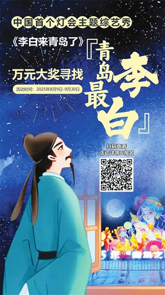 无论你是男是女,是老是少,是中国人还是外国人,只要你有李白情怀,敢秀敢演,都可以报名参加!记者从2025年“青岛之夏”艺术灯会主办方处了解到,本届灯会将特别推出中国首个灯会主题综艺秀——《李白来青岛了》,现面向全社会征集李白扮演者。活动期间,入选的“李白”们将身着古装,在灯会现场完成任务、表演才艺、与游客互动,并拍摄视频在抖音等各大平台发布。最终,点赞最高的“李白”将获得价值1万元的丰厚奖品。