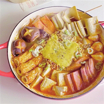 一个人的拌饭冷面、两个人的炸鸡啤酒、三个人的火炉烤肉、一群人的部队火锅。韩国料理中的部队火锅是多人聚餐的首选。在韩国,吃部队火锅的大多数是年轻人。走进一家韩式餐厅,无须担心被菜单上的价格惊掉大牙,不需要付出吃土的代价,朋友们围坐在火锅四周,看着各种食材在滚沸过程中逐渐融合,热乎乎地大勺大块地塞入口中,在秋冬时节还有什么比这更满足的呢?