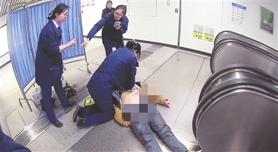 在扶梯口处,一位60多岁的男乘客仰卧在地,面色苍白、呼吸微弱。孙瑶跪地检查,与此同时,车站工作人员周新超、闫鹏、宓雨禾与保安单宝龙,快速用屏风围出救援区域,引导客流、维持秩序。