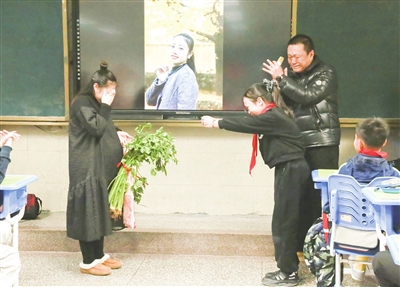 因此,离校前的最后几天里,矫建悦总在班级里转,嘱咐嘱咐这个,叮嘱叮嘱那个,恨不得把分别几个月的话全交代完。本学期的最后一天,期末考试刚结束,她正往班级走,只见走廊里学生们整齐地靠边站成两排。“你们要干啥?”矫建悦疑惑不解,只见学生们纷纷从背后拿出一枝枝鲜花,递到矫建悦手里,就这样一路走、一路收,矫建悦的眼泪绷不住了,孩子们的声音也哽咽了。“矫老师,祝您一路生花!”“矫老师,我们等您回来!”